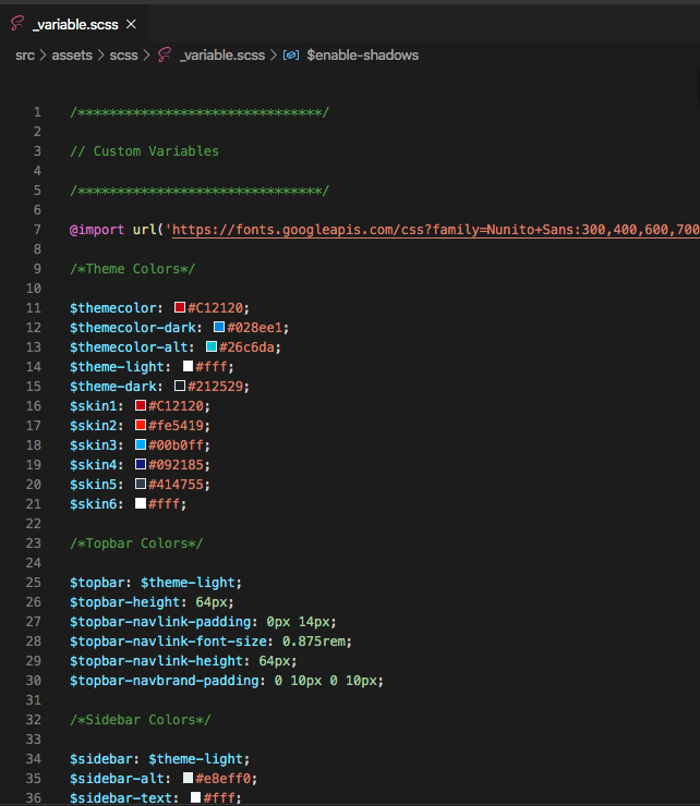 This file is located under src/assets/scss/_variable.scss File enables customizable variables which are used accross the app. Template comes with pre-defined 6 color skins, which can be seen on top of this file. You can update values here and add your own colors in this section, which will be available across app.