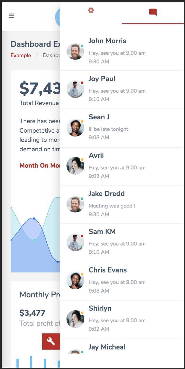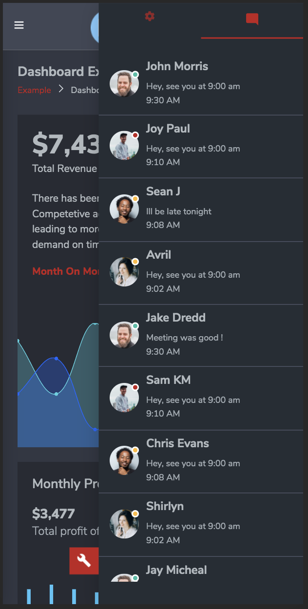 Template features 6 customizable color themes and 2 modes - Light and Dark. These can be accessed byt clicking red settings icon on right side of the app. It opens a drawer from right which can chage app colors during runtime. Note that customizable parts in app are header bar, sidebar, and menu color. Other than these, dark or light theme effect overall app and its pages.