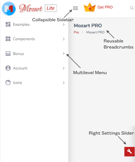 Mozart Angular Lite comes with a boilerplate code which has most needed part of any new application - Sidebar / Menu, Collapsible Sidebar, Breadcrumbs, Multilevel Menu and much more ! We have spend efforts & time so that you don't have to !